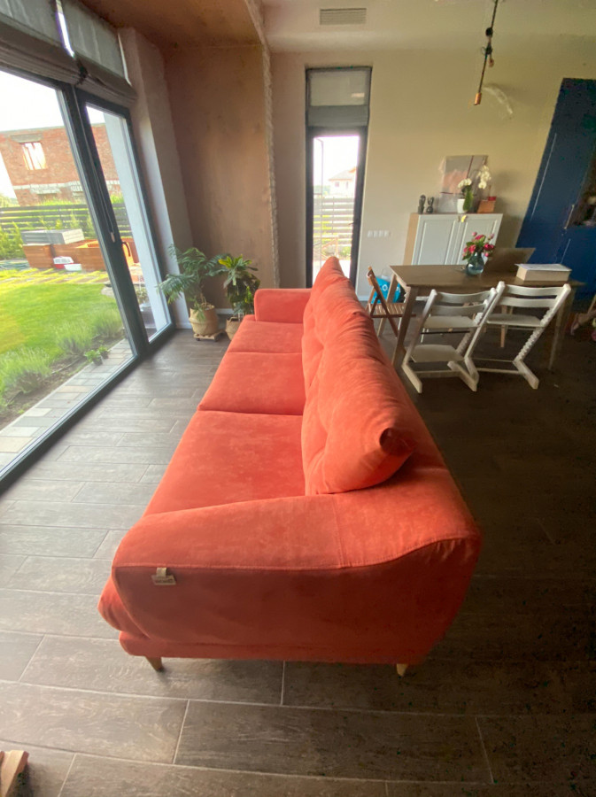 Купували диван в тканині вершковий велюр. По-перше, це гарнючий магазин: супер круте обслуговування, дуже привітне і дуже клієнтоорієнтоване. Одне з небагатьох місць, де ідеально ввічливі та пунктуальні і менеджери, і водії які ЗАВЖДИ ідуть на зустріч. Зразки тканин і досвід менеджера дуже допомогли визначитись. По-друге, меблі класно запаковані і з естетичної і з практичної точки зору. Їх приємно отримувати і доїхали вони в ідеальному стані. Ще й подаруночок вклали❤️ за це окрема вдячність! По-третє, меблі просто афігєзні. Користуємось вже 4 місяці. Це найзручніші меблі, на яких я сиділа. Сидіння повнорозмірне. Чоловік зростом 190 см може зручно всістися, а це рідкість. Спинку можна підсунути і зробити сидіння менше. Диван експлуатується сімʼєю з 3 котами і маленькою дитиною. Тканина не протикається кігтями, вовна збирається вологою рукою або губкою, плями теж відмиваються вологою губкою. Під диваном можна пропилососити. Робот-пилосос проходить під диваном але пилососити там чомусь не любить. Якщо заснути на дивані не болить спина. Пуф вміщає 2-х котів і 2 пари дорослих ніг, або 2-х дорослих, або 1 дорослого з підігнутими ніжками. Ну і звісно виглядають меблі дорого і затишно. За